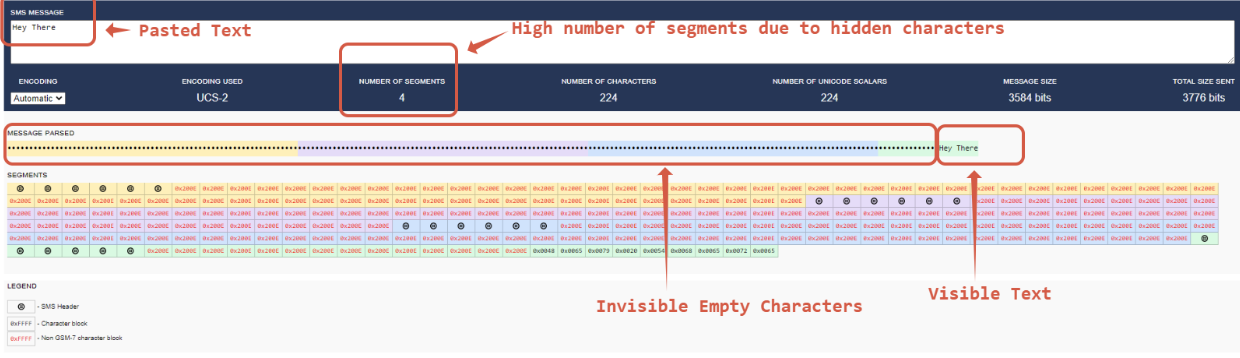 Many individuals & businesses copy/paste the SMS text body while designing automation. When you copy/paste text from a text editor software like MS Word or Google Docs, sometimes hidden characters get appended in the string. These hidden characters can not be seen by the user but they are present in the text.