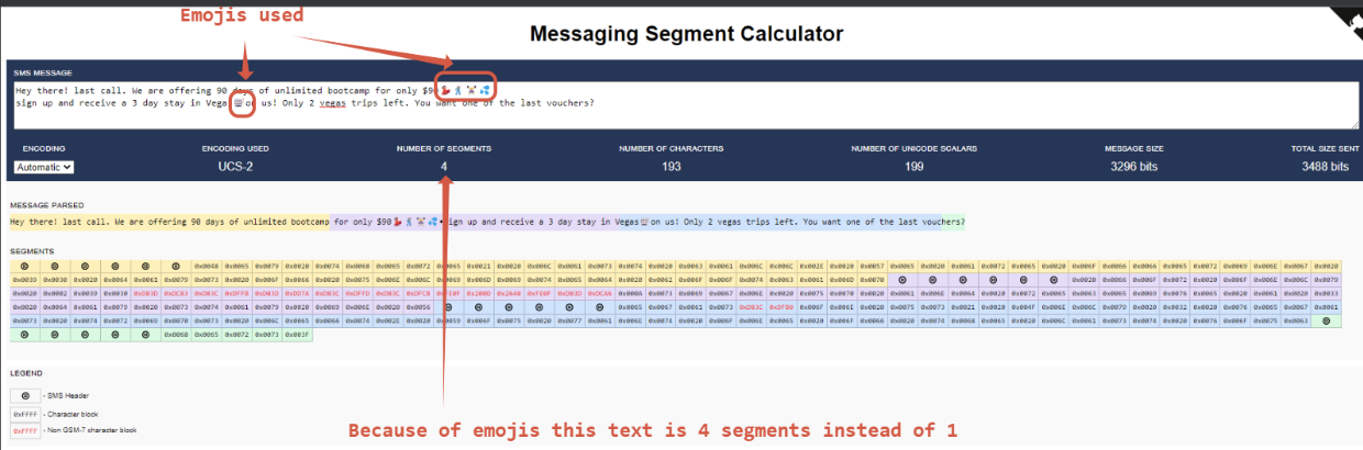 In the example below some emojis were used that increased the number of segments from 1 to 4.